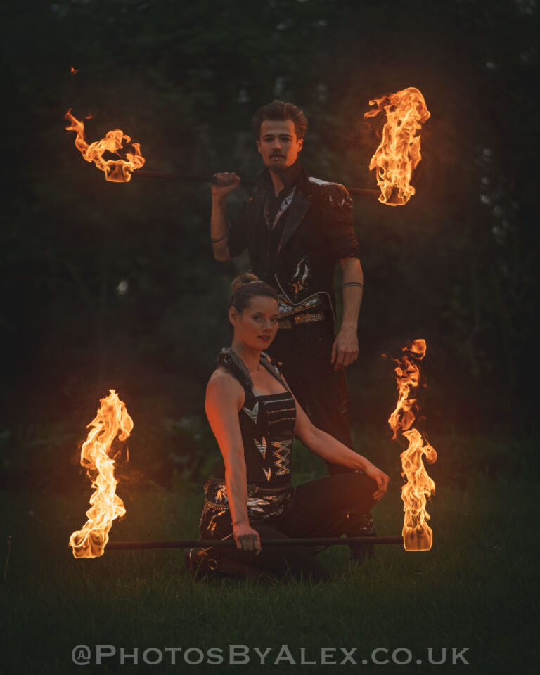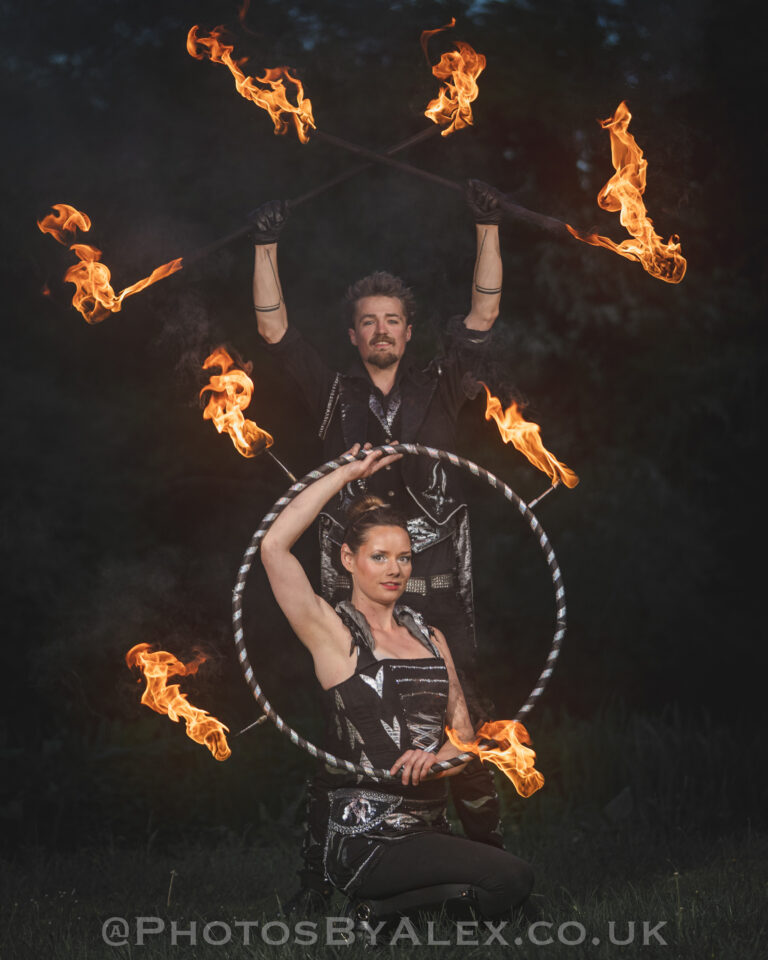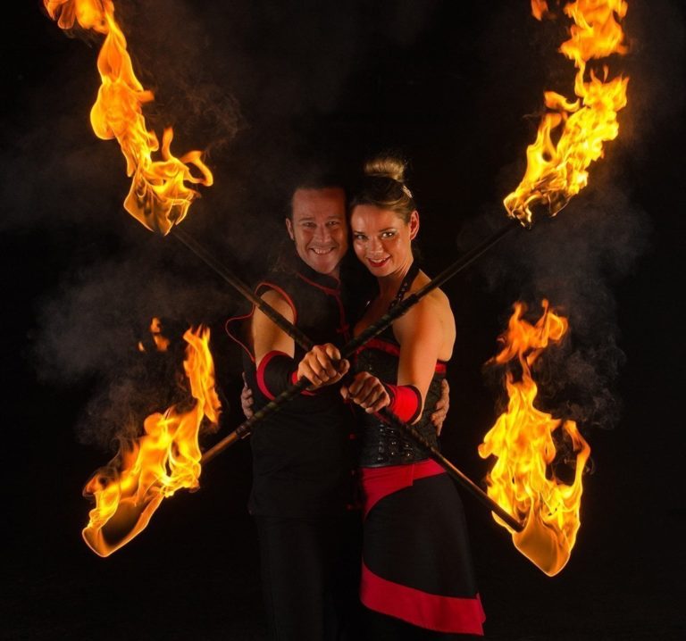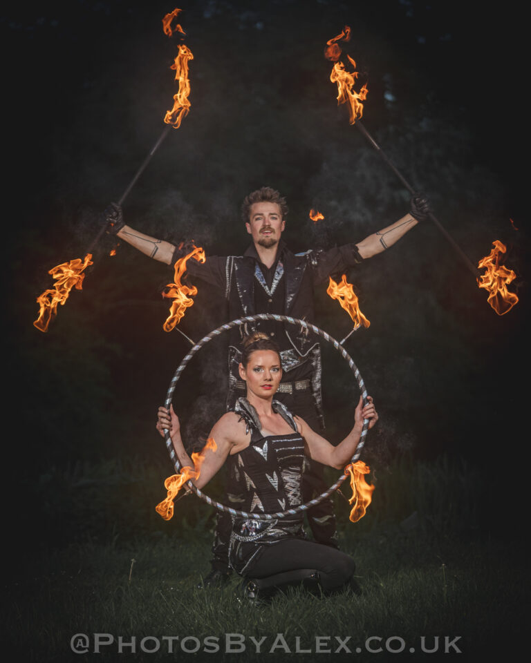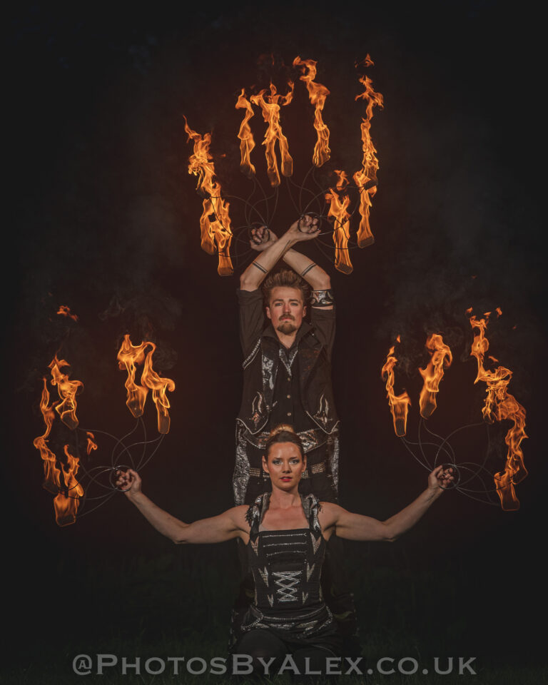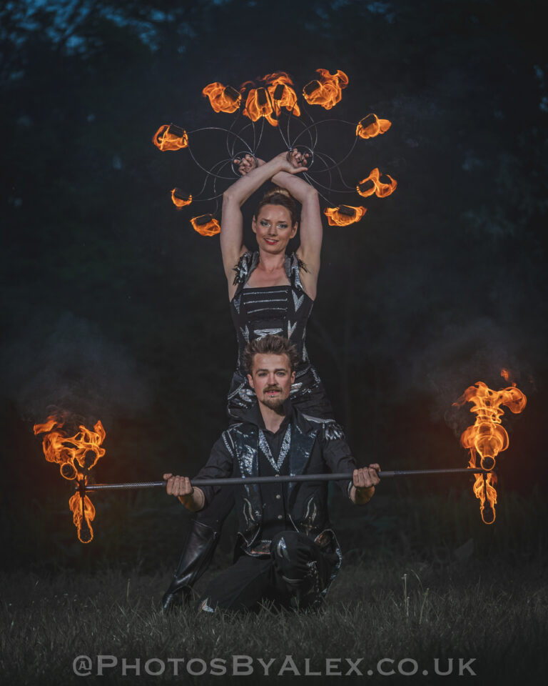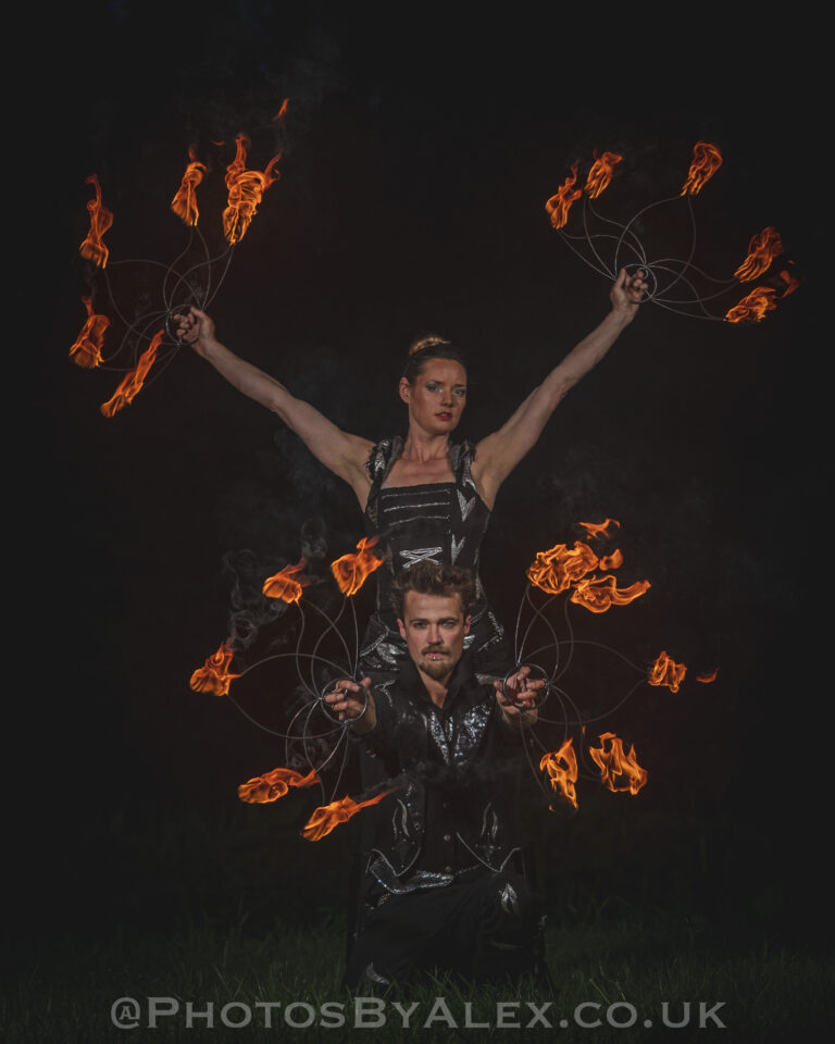 Duo feature fire shows are perfect for weddings, parties and larger events. Beautifully choreographed duets are set to music and performed with a variety of different fire props.