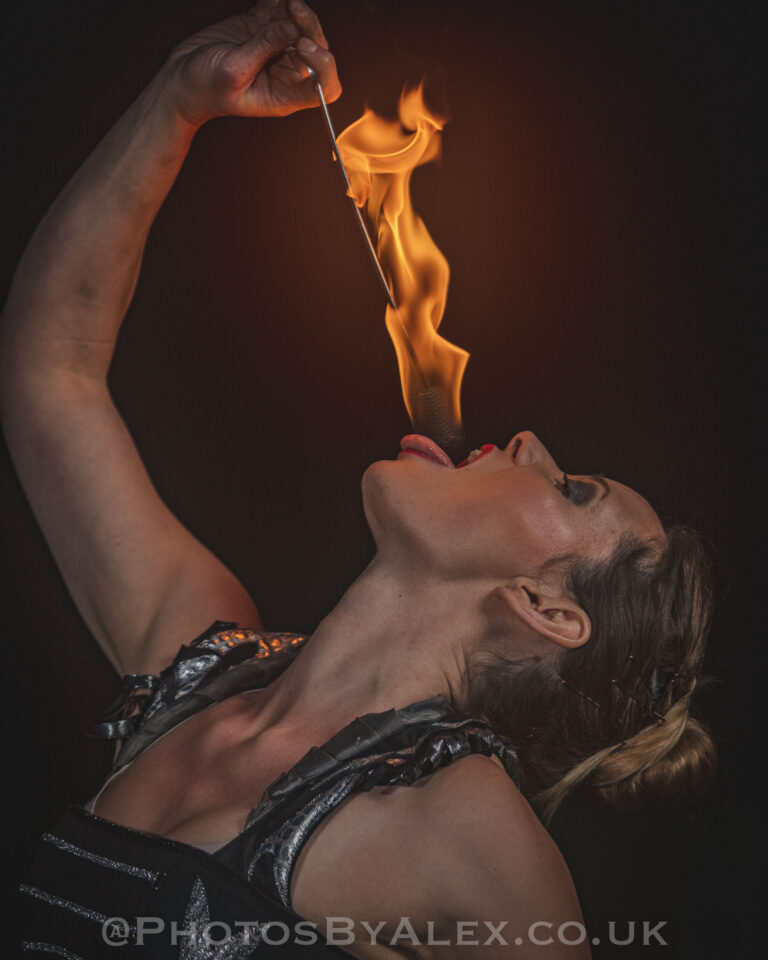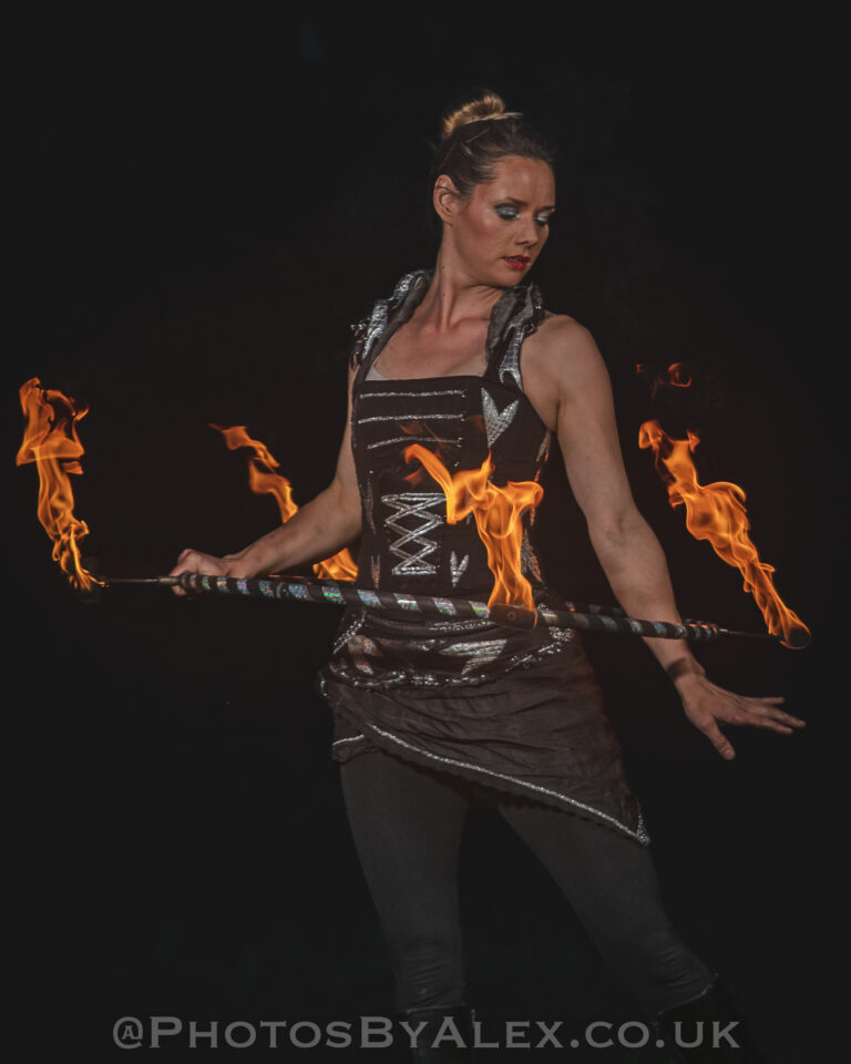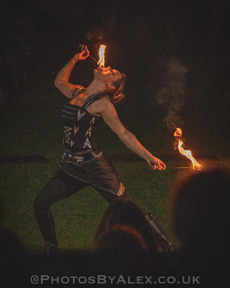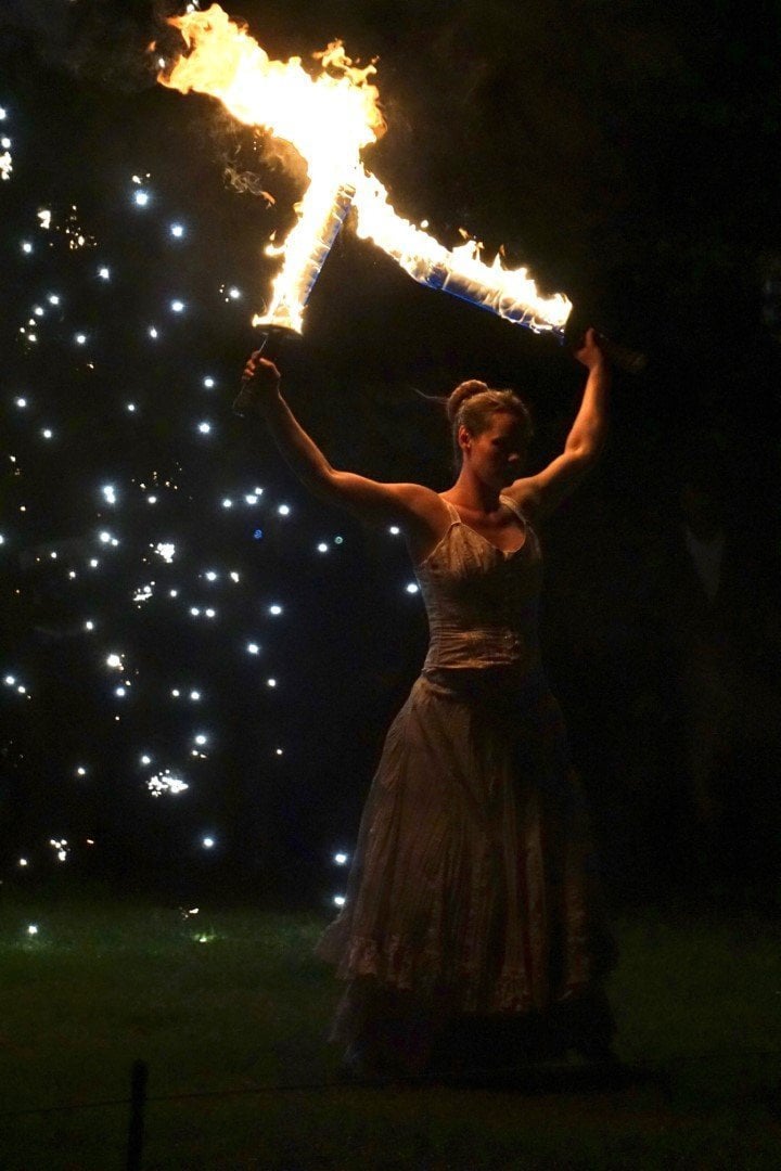 Our fire shows specialise in fire dancing which involves dancing with and manipulating flaming props. We use many different props including poi, staff, hoop, dragon staff, sword and fans. Props used depends on the show booked. Some shows include fire eating and body burning. Most of our shows don't include fire breathing as standard. If you particularly want a fire breather please let us know.