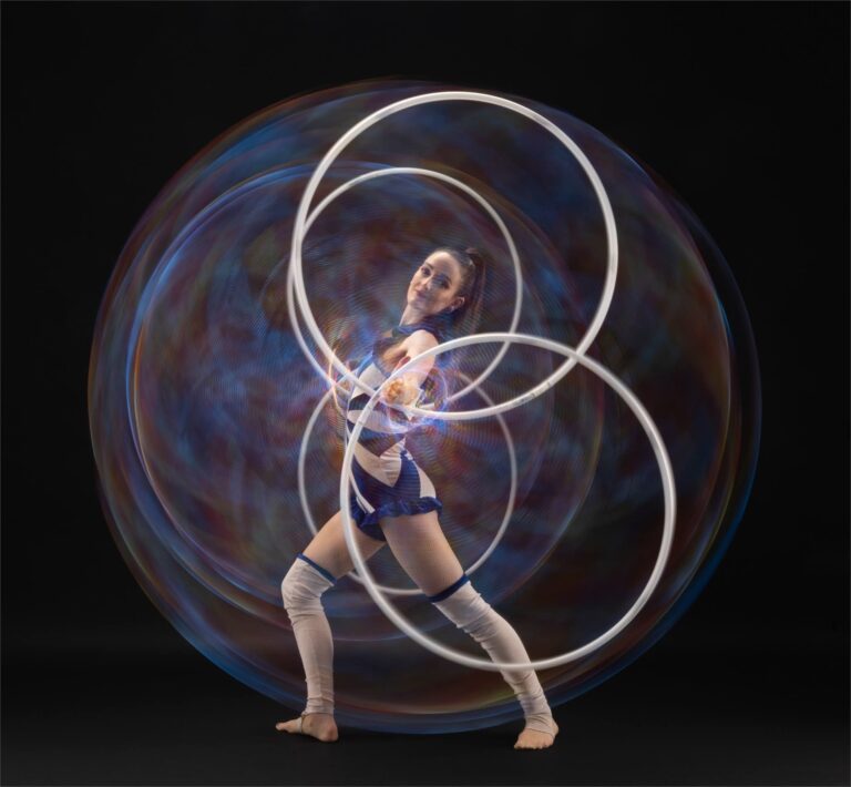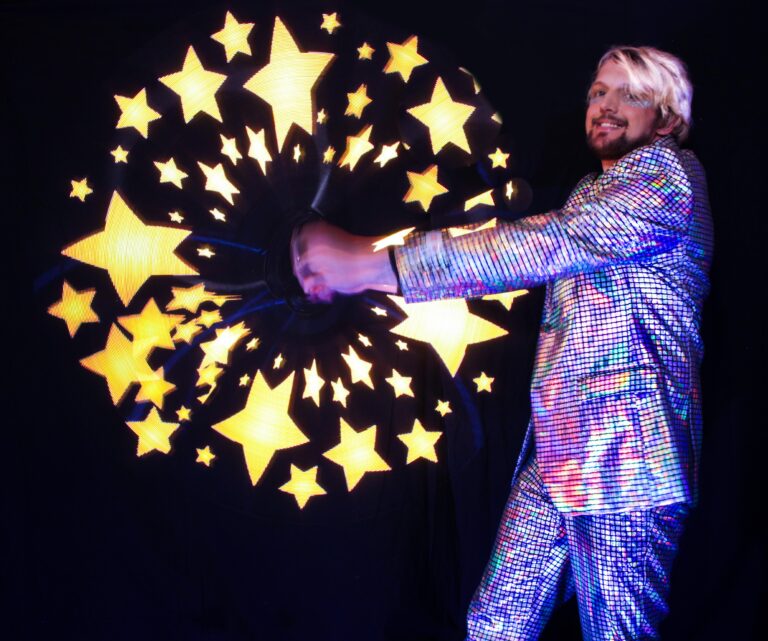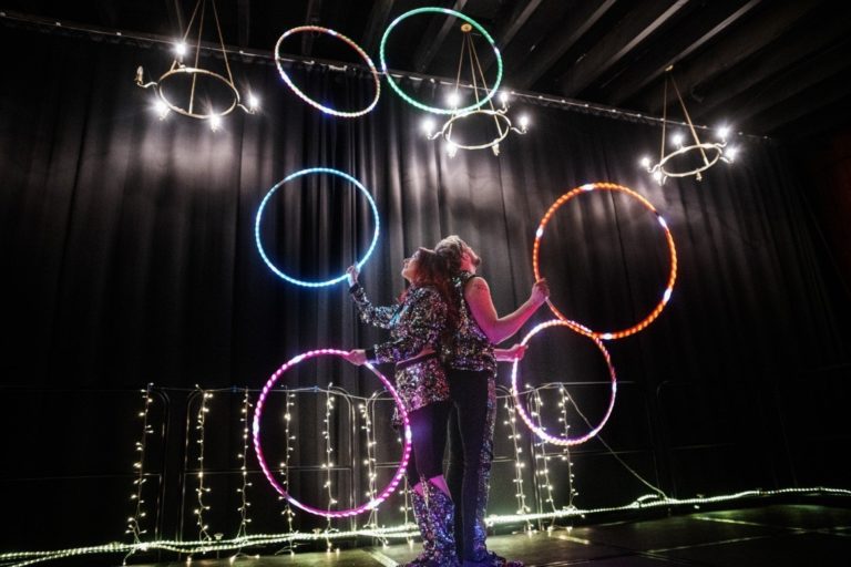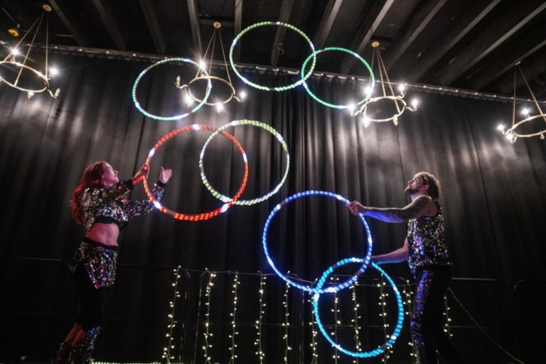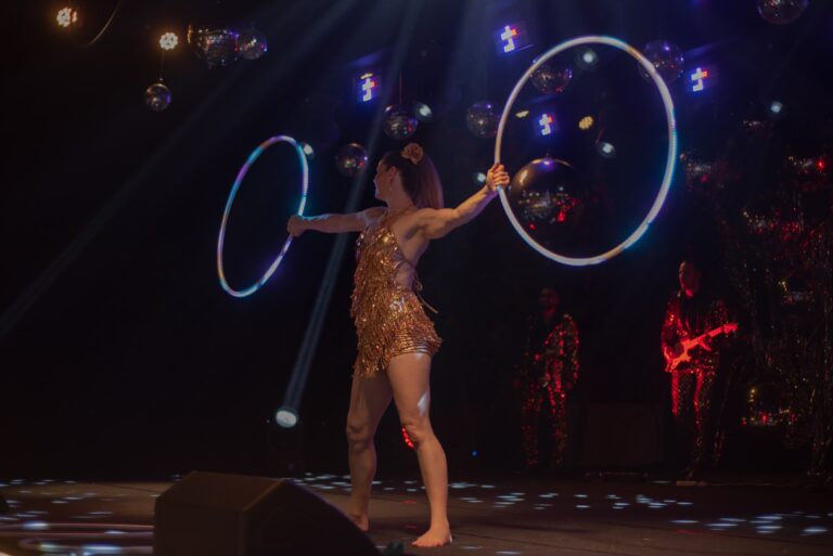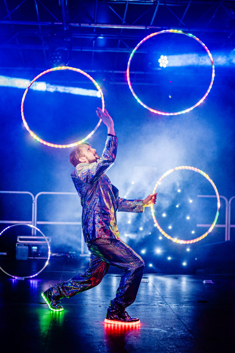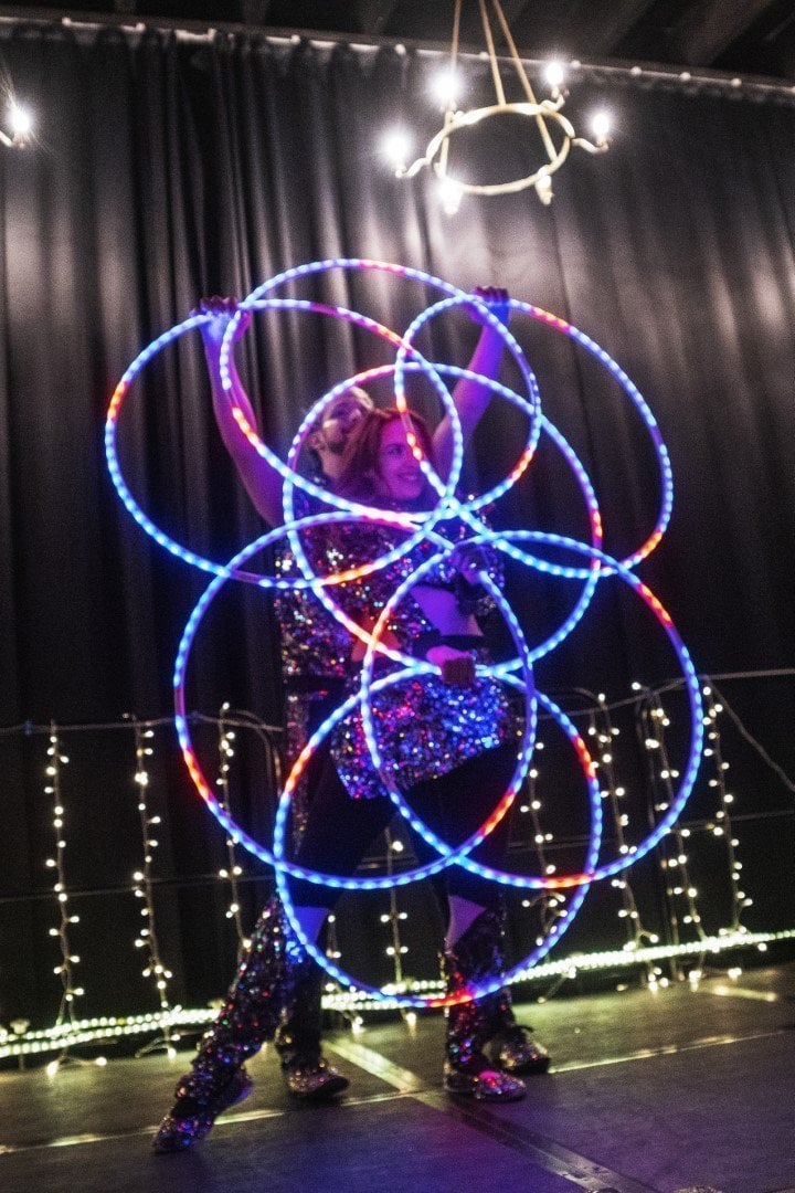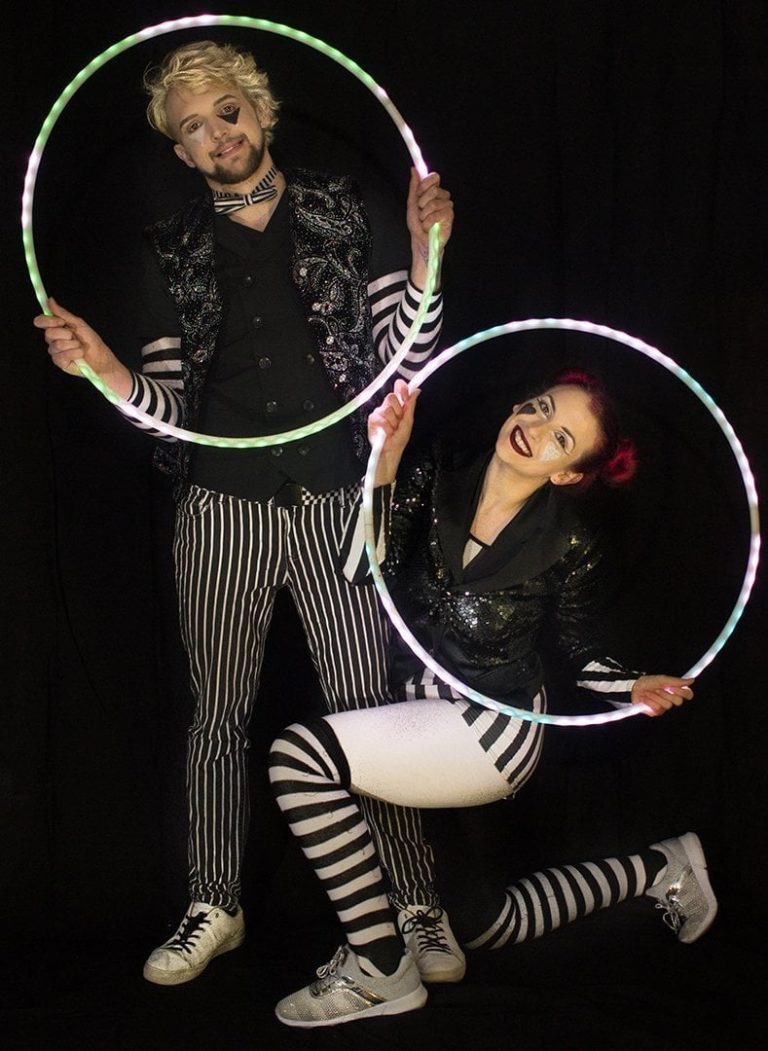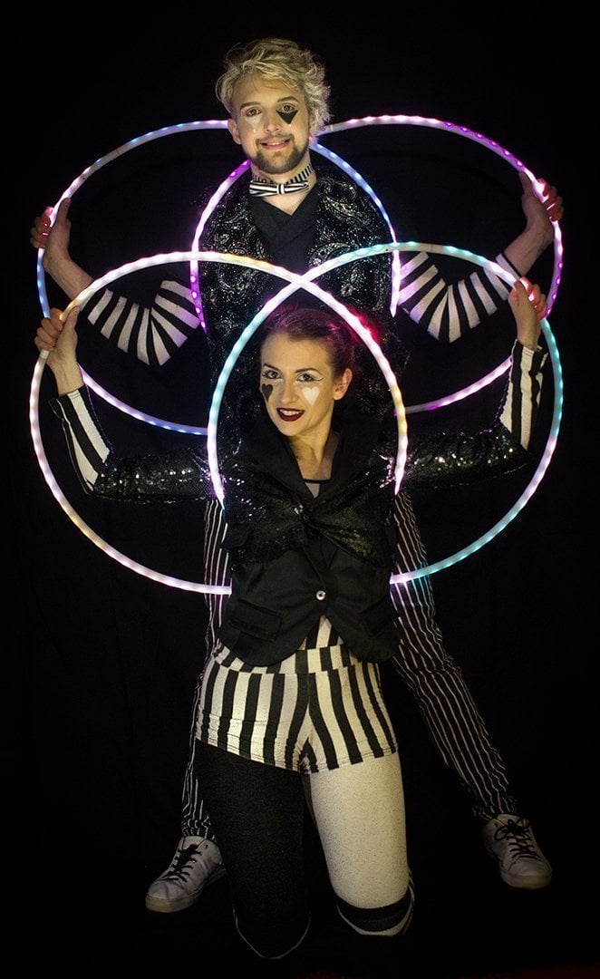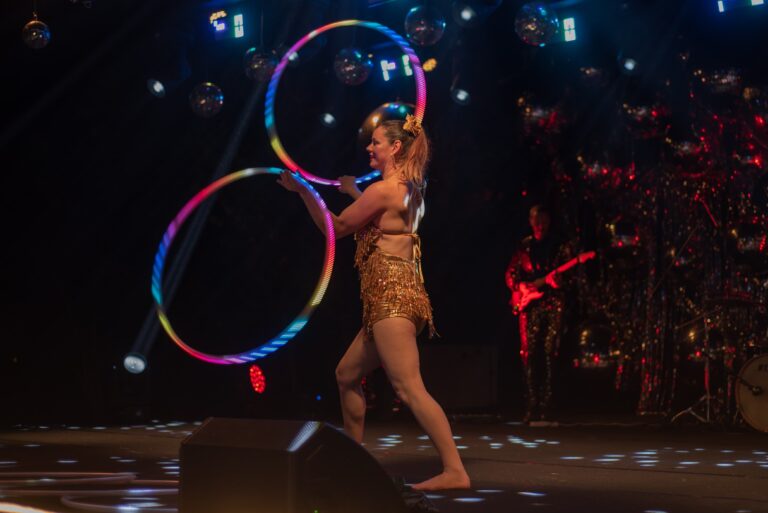 Fully choreographed energetic and athletic hula hooping stage shows. Erin uses multiple top of the range hoops which are programmed to the music and wears sparkly sequin costumes. Stage acts are one track long and perfect for cabaret and dinner shows. Electroswing and Disco acts available.