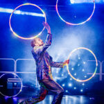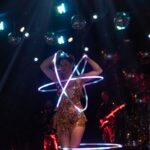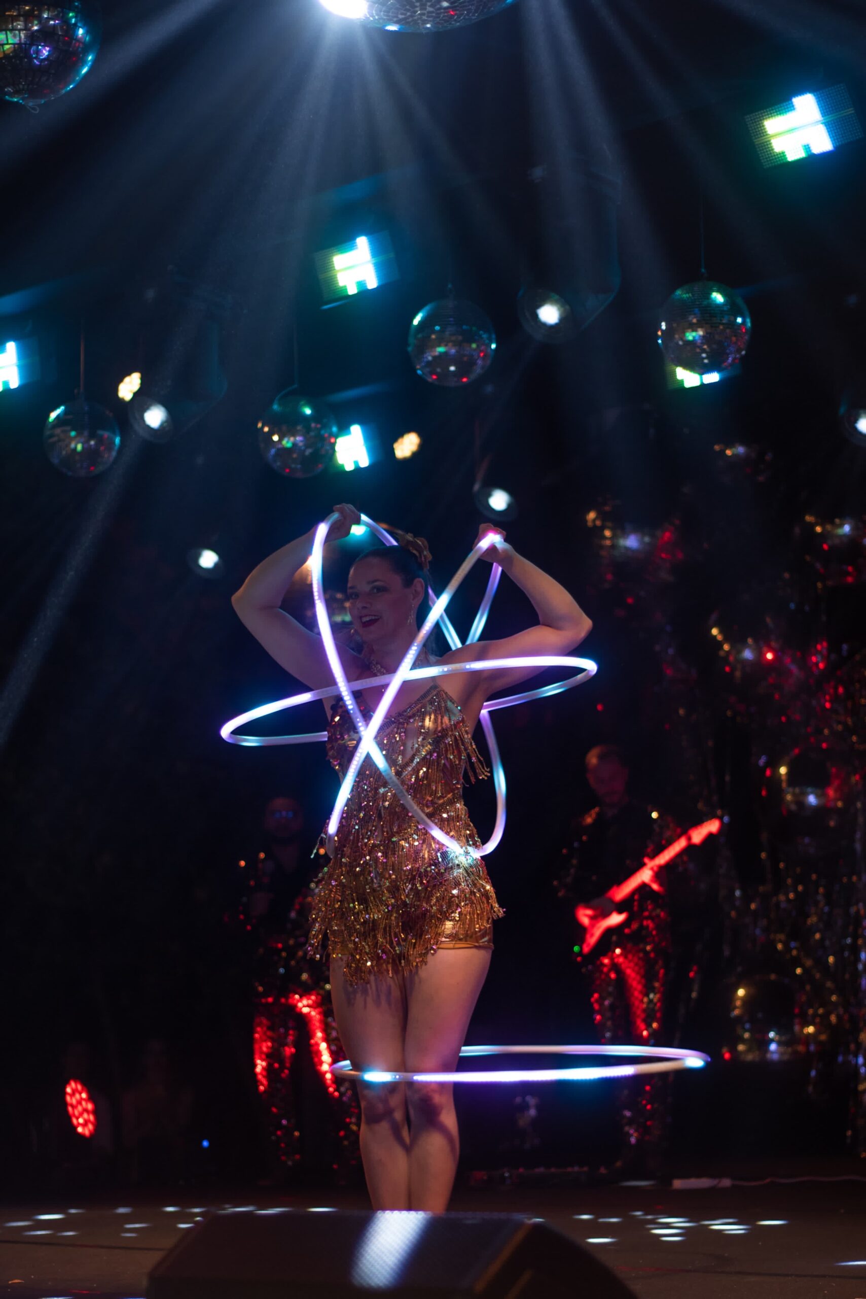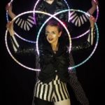 Fully choreographed energetic and athletic hula hooping stage shows. Erin uses multiple top of the range hoops which are programmed to the music and wears sparkly sequin costumes. Stage acts are one track long and perfect for cabaret and dinner shows. Electroswing and Disco acts available.